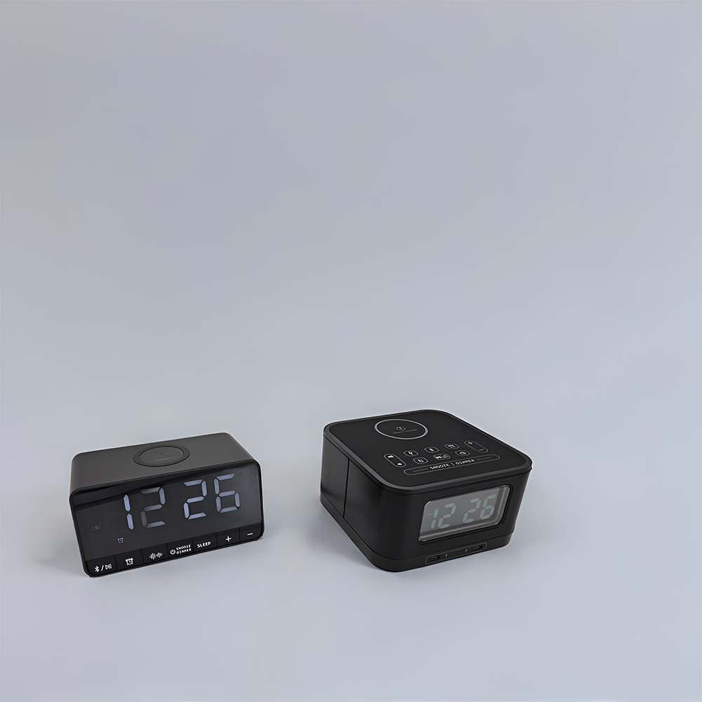 Lua Alarm Clock - A modern bedside essential with a 3.5″ dimmable LCD display, the Lua combines wireless charging, USB & Type-C ports, Bluetooth speaker, dual alarms, and FM radio – helping guests wake on time and stay connected in comfort.