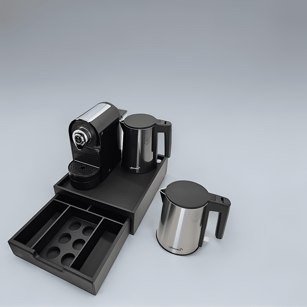 A complete refreshment hub, the Grande C-Box keeps kettles, coffee machines, pods, and teas neatly organised, enhancing both style and convenience in guest rooms.