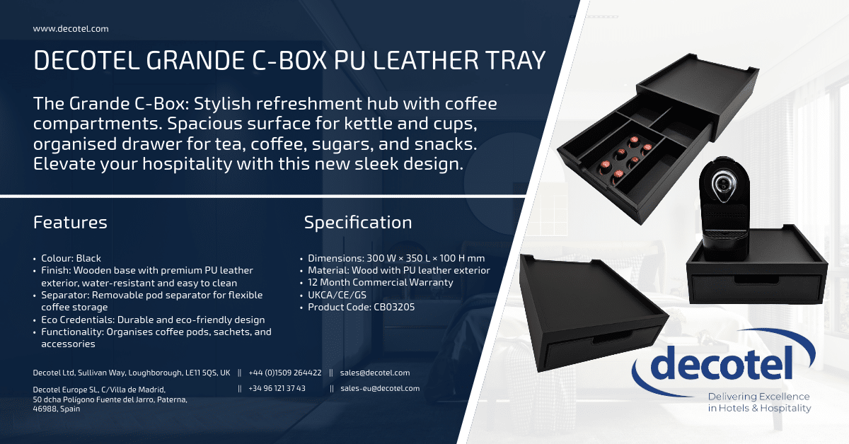 The Decotel Grande Coffee Box is a stylish and practical refreshment hub, perfect for hotel rooms. Designed for coffee machines, kettles, and cups, it features a spacious surface and a neatly organised drawer for pods, tea, sugars, and snacks.