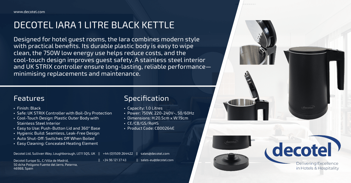The Iara 1.0L Kettle in Matt Black features a durable plastic outer body with a smooth, contemporary finish — a stylish and practical choice for hotel rooms. Its compact footprint and low 750W power draw make it highly efficient, while the double-wall, cool-touch design ensures guest safety. Inside, a stainless steel lining and UK STRIX controller deliver reliable, consistent performance every time.