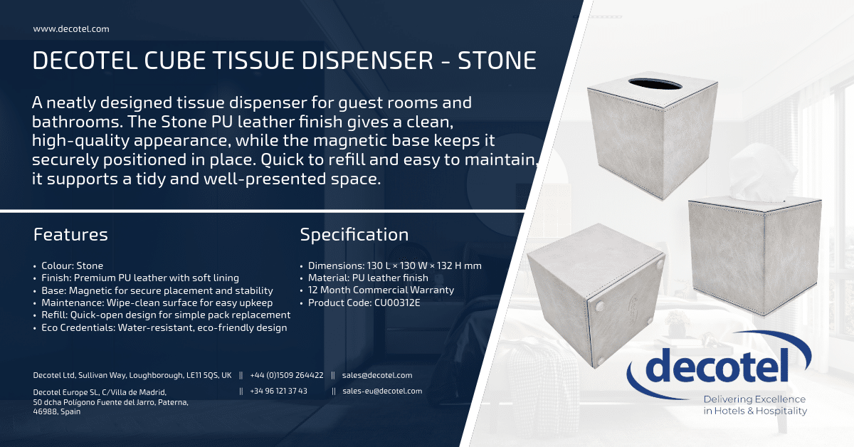 The Decotel Cube Tissue Dispenser in Stone offers a clean and practical way to keep guest rooms and bathrooms organised. Its PU leather finish delivers a premium look, and the magnetic base keeps the unit stable. With an easy-refill design and wipe-clean surface, it provides a smart, reliable solution for everyday hotel use.