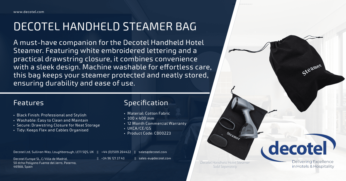 This protective bag is designed for the Decotel Handheld Hotel Steamer, featuring white embroidered lettering and a secure drawstring closure. Machine washable for effortless upkeep, it keeps the steamer safely stored, helping to maintain its condition and prolong its lifespan.